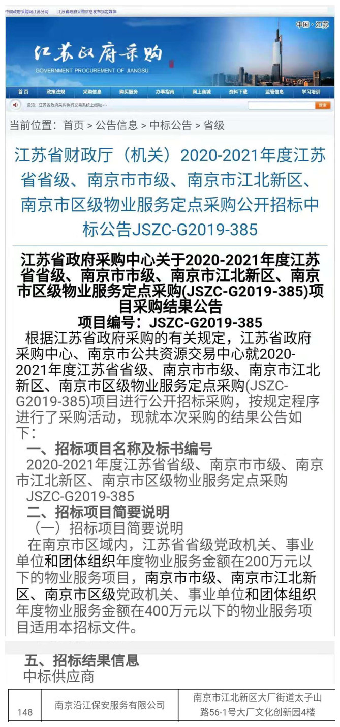 “南京沿江保安服務有限公司”憑借多年的積累和全體員工的辛苦付出、不懈努力,在本次招標活動中正式成為2020-2021年度江蘇省省級、南京市市級、南京市江北新區、南京市區級物業服務定點采購指定單位。