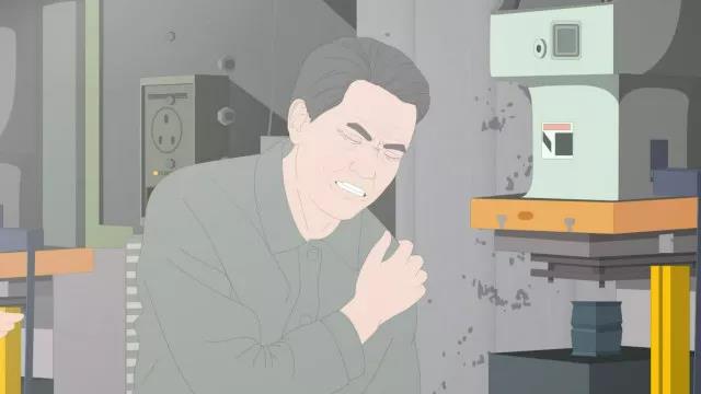 車間內一片忙碌的景象,工人們都在有條不紊地干活。馮剛在準備獨自拾起一件重物的過程中,突然感到肩膀疼痛,使不上勁兒。重物掉落在地上。